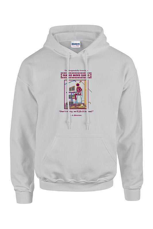 The Tonguedolly Exercises, FMQ, Don't Worry, We'll Fix it in Post, Lite, Cranberry & Gold, Gildan 50/50 Cotton, Unisex Hoodie